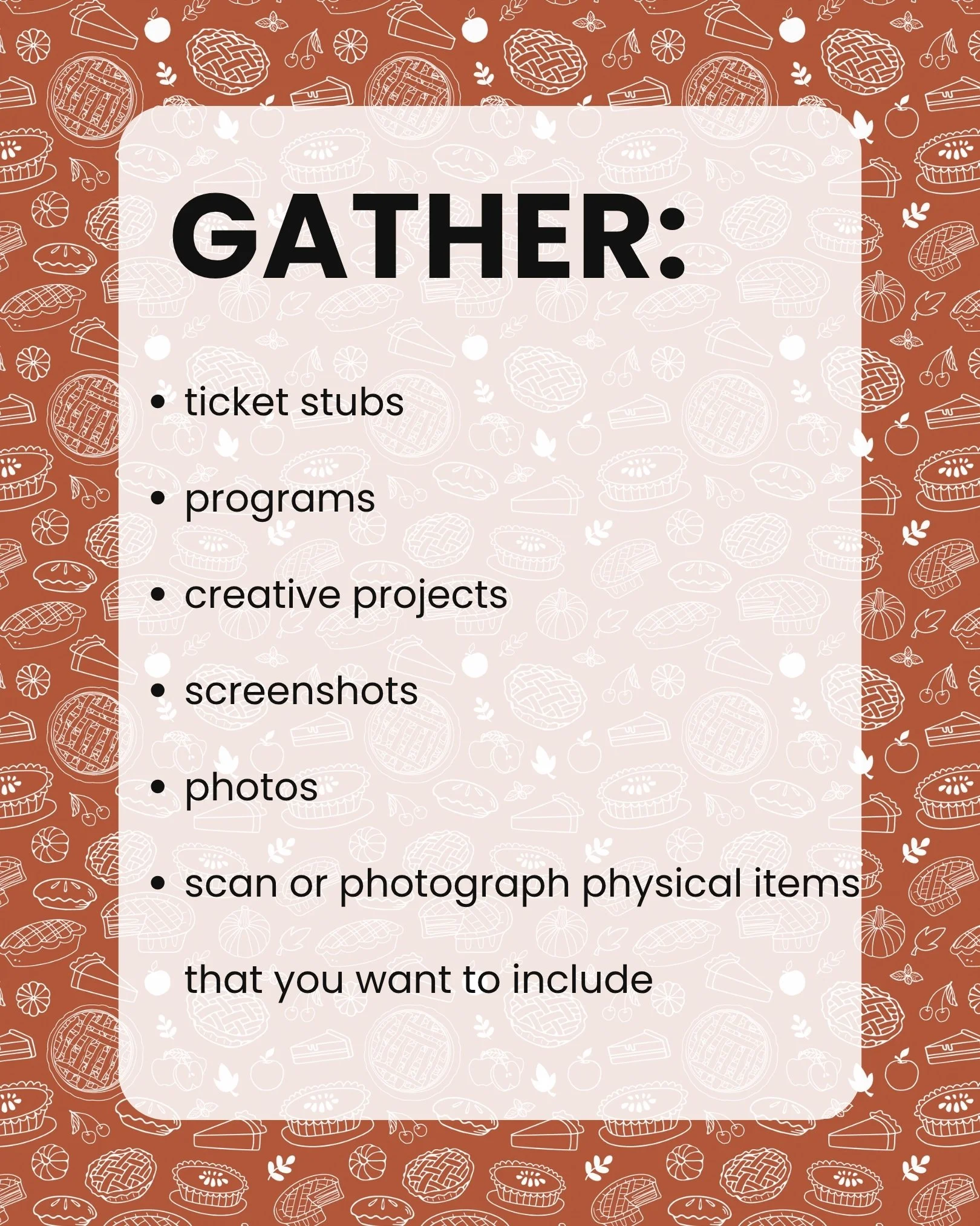 Gather small pieces of memorabilia such as ticket stubs, cards, or event programs. You can photograph or scan them to include digitally.