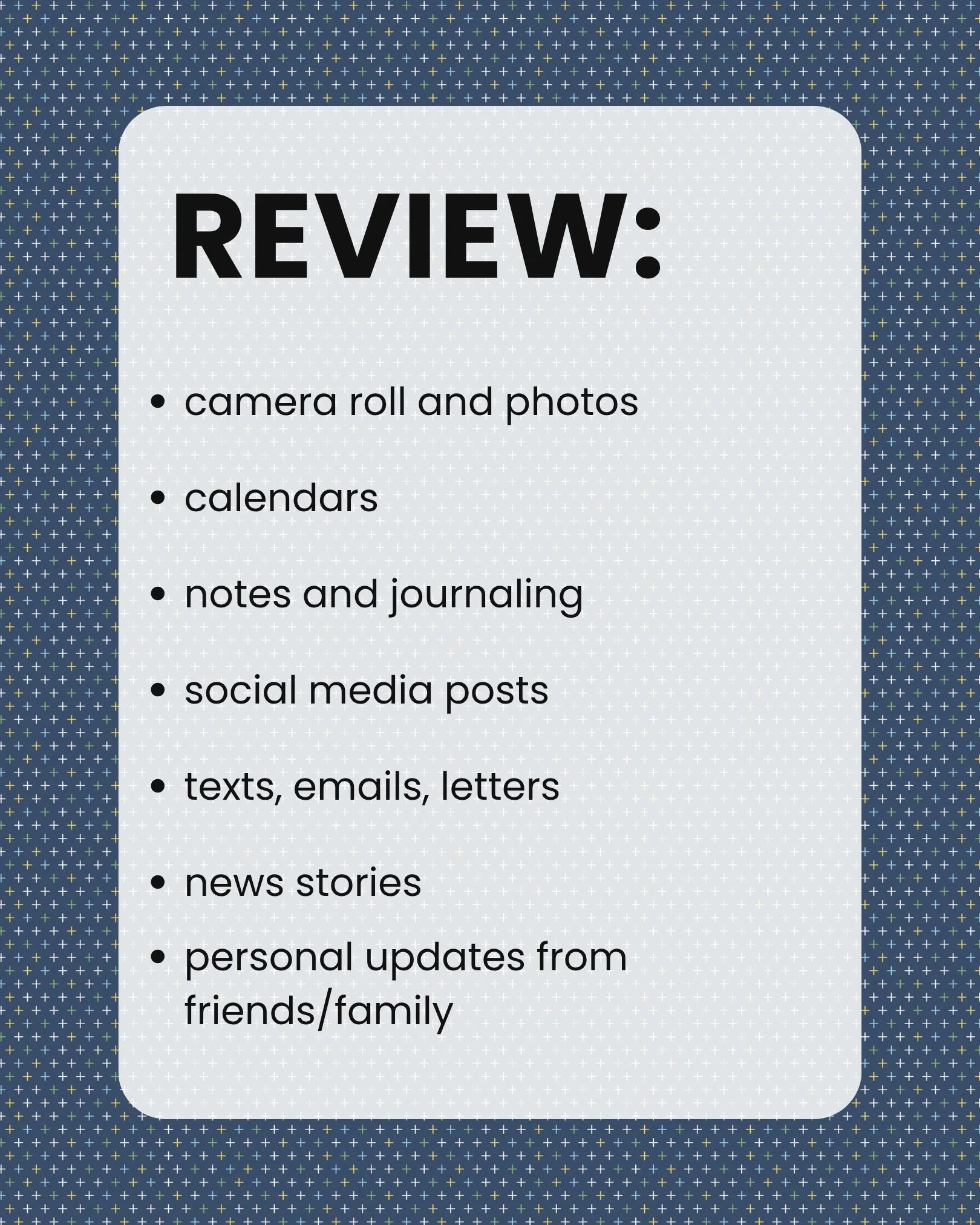 Other ideas: Capture your joys, challenges, travels, goals, favorite foods, hobbies, or even funny memes that made you smile.
