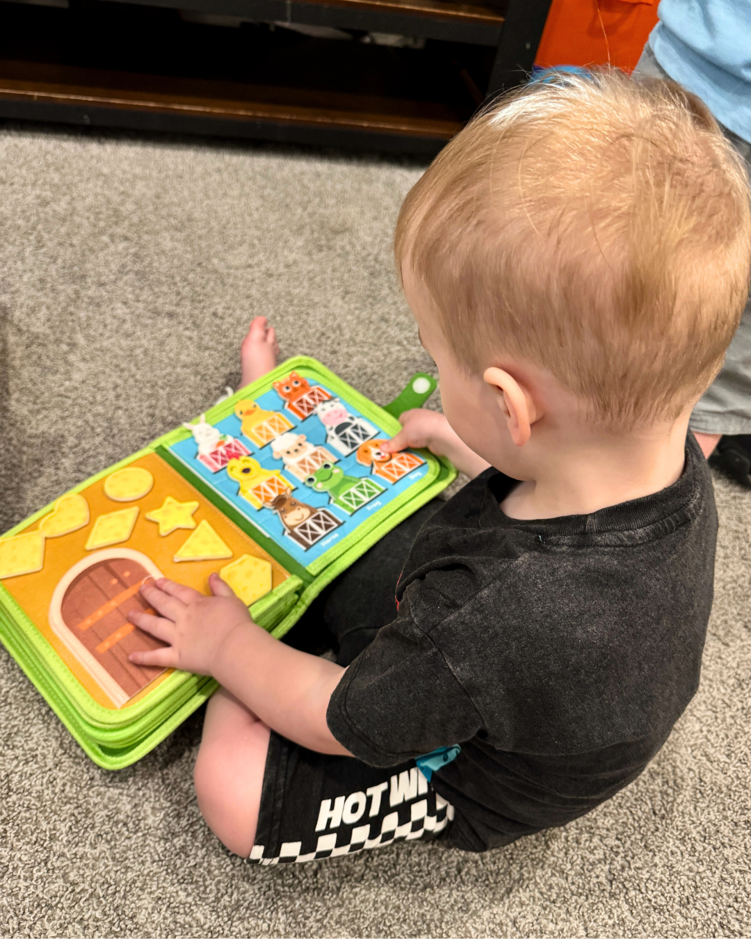 This moment made me smile. My two year old grandson, loving a farm busy book that was a gift from his great-grandma (my mom).
