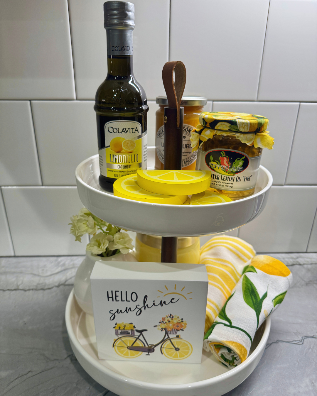 I always have this small tiered tray on our kitchen desk and I change out the decor based on the current holidays or season. I felt bored with the items I usually use, so I went with something totally different and bought several lemon themed items on Amazon. It makes me feel happy!